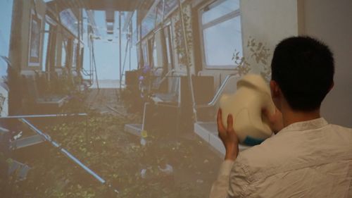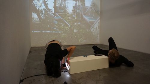 Object (Model_05292002) located in this gallery is the opposite. It does not want to be looked at, it wants to be held. To be felt and lifted up from it's podium. The motions of this model and the users interaction when holding it affect how the scene appears and changes on the wall.